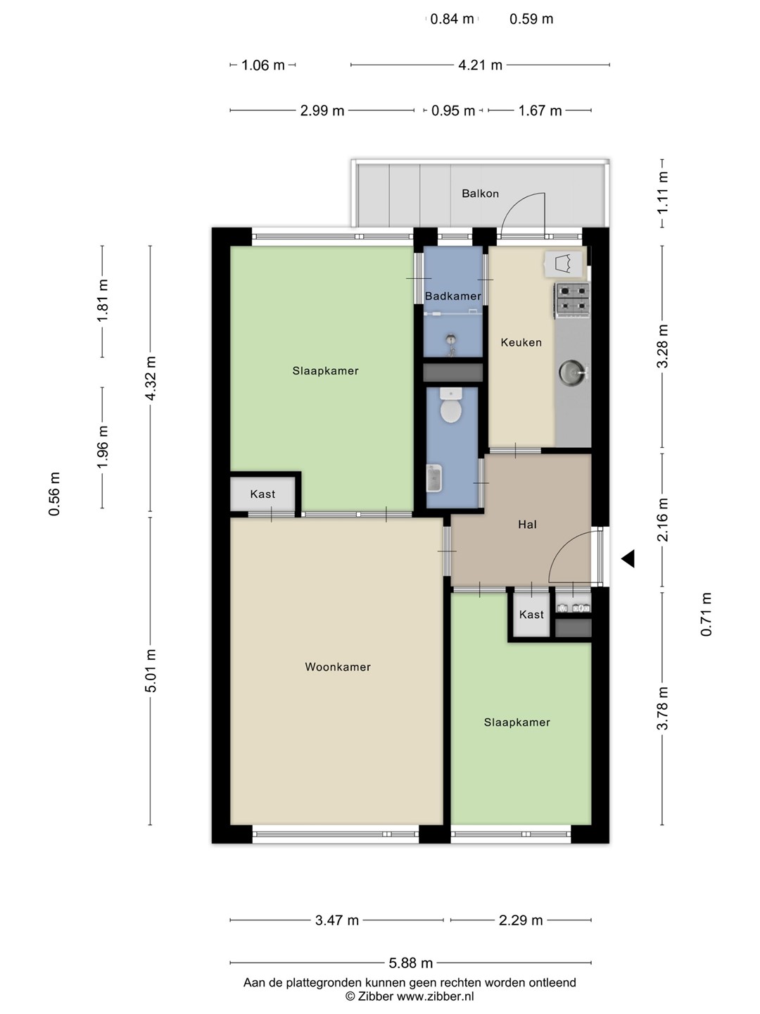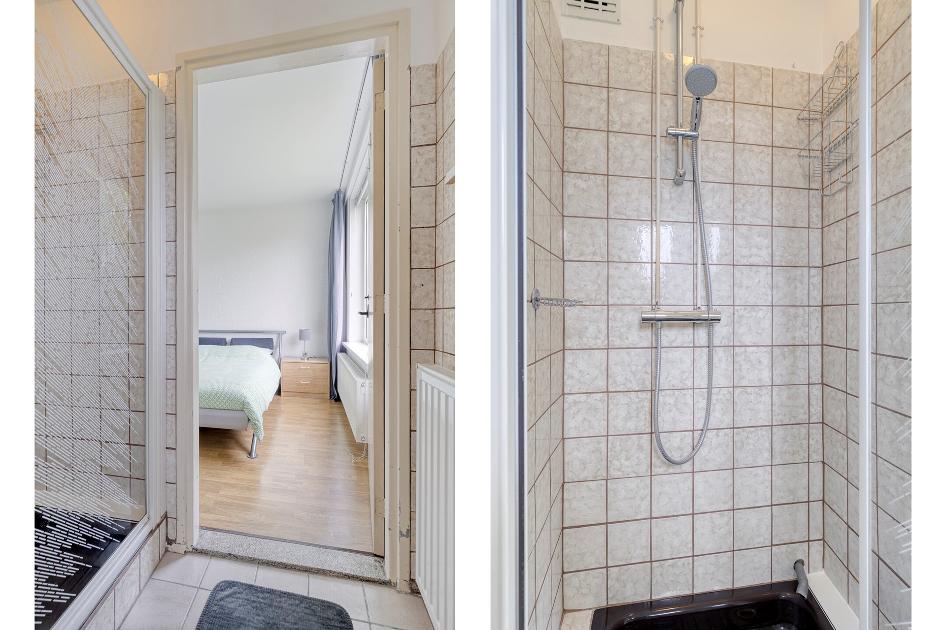 Terug naar de hal en door naar de keuken. Deze is netjes uitgevoerd en voorzien van een koelkast met vriesvak, een 4-pits gaskookplaat en een afzuigkap. Ook vind je hier de opstelplaats voor de cv-ketel en de wasmachine. Vanuit de keuken stap je direct het balkon op. Het balkon ligt op het zuidwesten, wat betekent dat je hier heerlijk van de middag- en avondzon geniet. Een fijne plek om na een werkdag nog even buiten te zitten. Via de keuken is de nette badkamer bereikbaar. Gewoon netjes en voorzien van een douchecabine. We kunnen ook direct door naar de achter slaapkamer. Die dus ook via de woonkamer te bereiken is. Gewoon groot, toegang naar het balkon en ruimte voldoende. Via de woonkamer naar de hal en de 2e slaapkamer aan de voorzijde. Ook riant van formaat en ideaal als werk- of slaapkamer. Beide kamers zijn ook licht en praktisch van formaat.