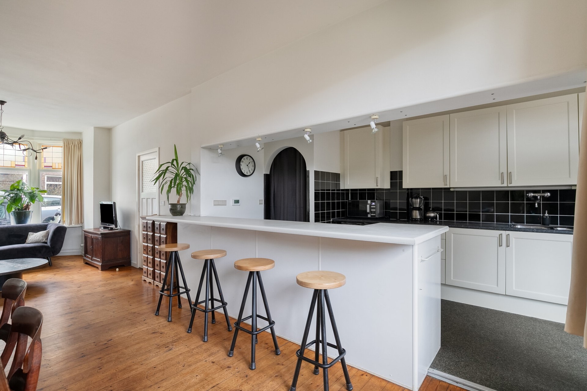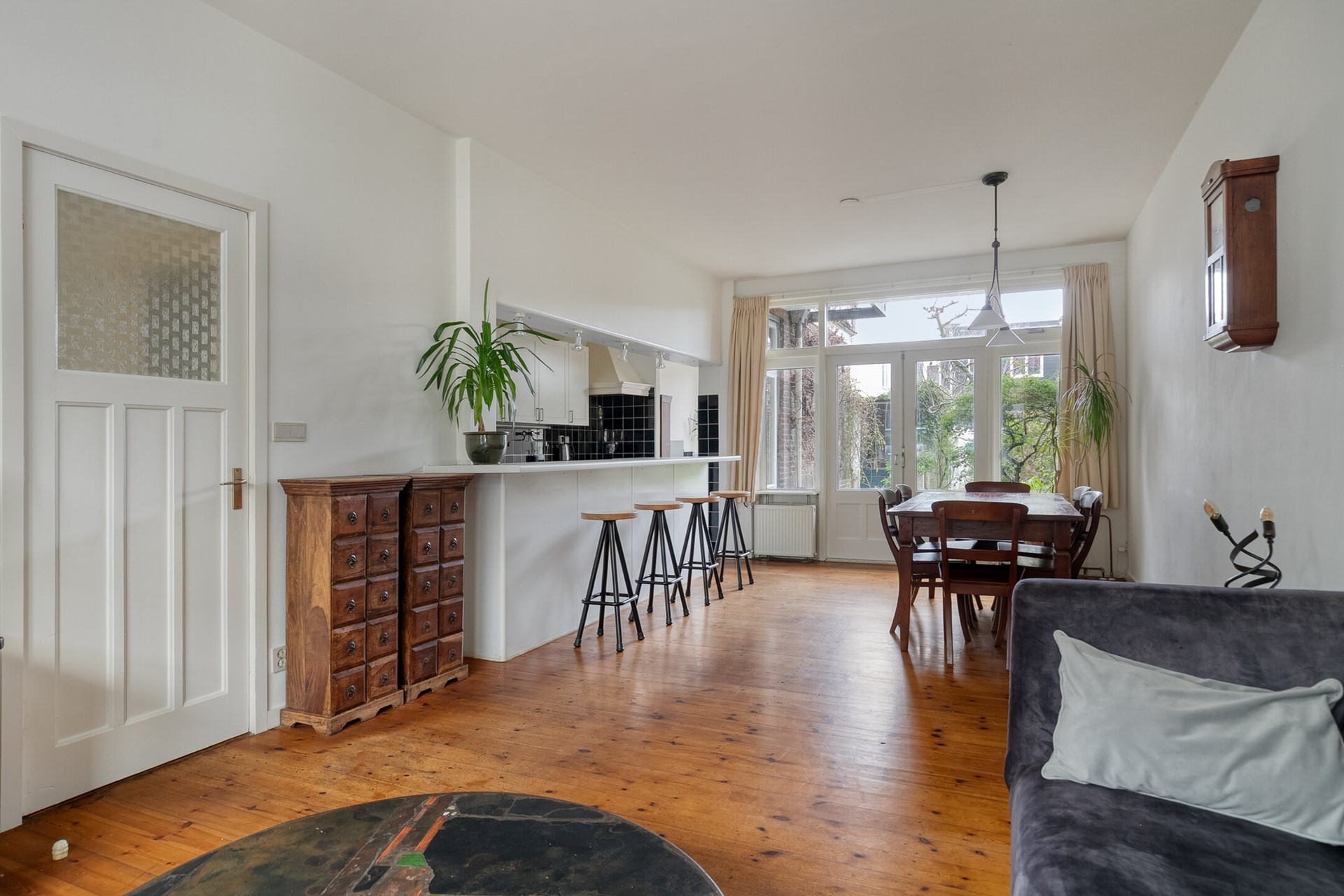 We lopen door naar de woonkamer en hier valt het gesprek even stil. Wat een ruimte. Wat een hoogte. Met een breedte van circa 3,70 meter en een diepte van bijna 8,40 meter – en dan nog de open keuken – voelt deze leefruimte bijna als een balzaal. De houten vloeren, de fraaie deurposten en de openslaande deuren naar de tuin versterken het gevoel van sfeer en warmte.