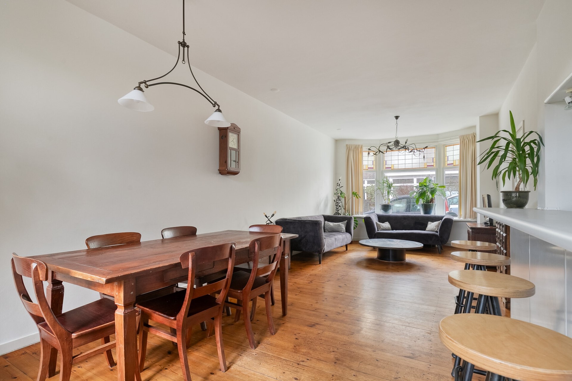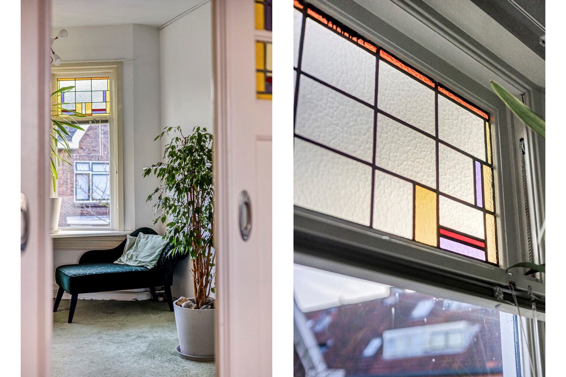 Spieghelstraat 4, Leiden is zo’n huis dat je al raakt vóórdat je binnen bent. Terwijl je de straat inloopt, voel je het meteen: karakter, ritme en allure. De fraaie jaren ’30-architectuur, de erkers, de rijke gevels en het glas-in-lood kondigen aan dat dit geen doorsnee tussenhuis is. Dit is een voormalige boven- en benedenwoning die is samengevoegd tot één volwaardige, indrukwekkende 8 kamer gezinswoning – een huis om van te dromen.