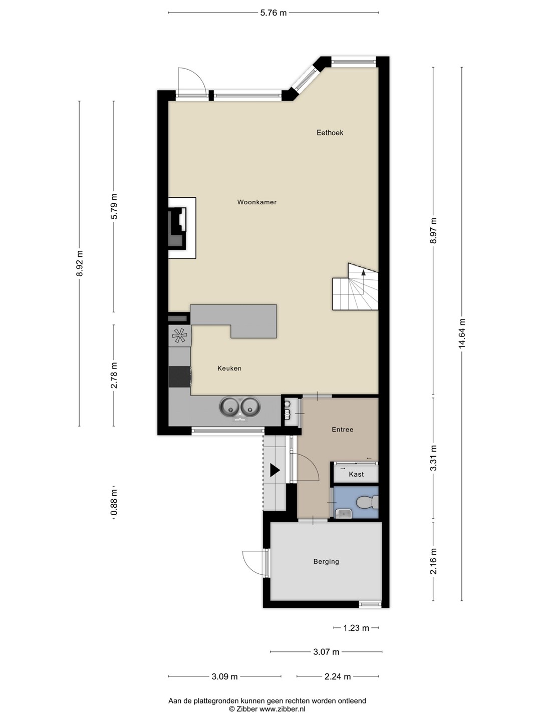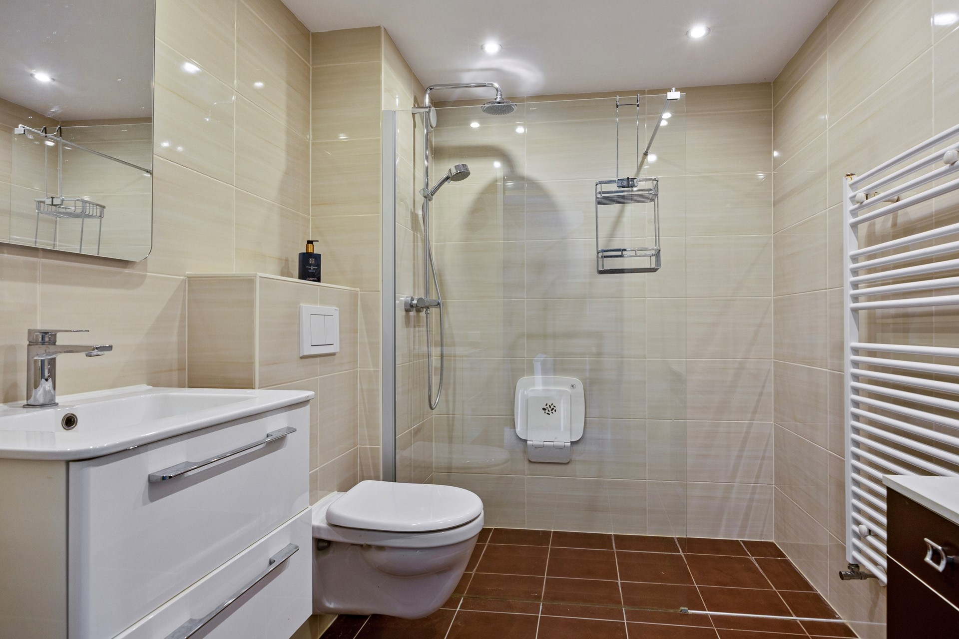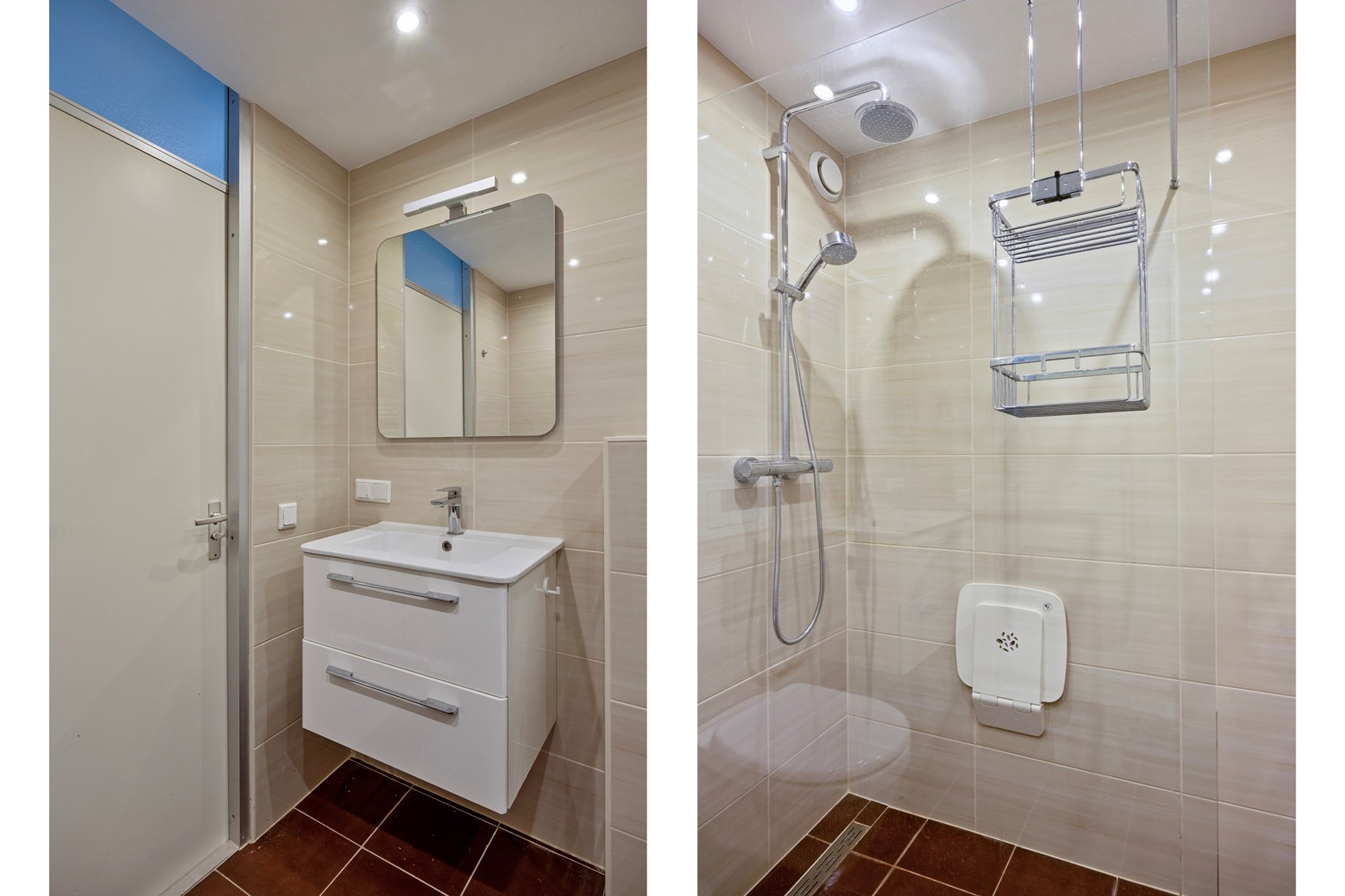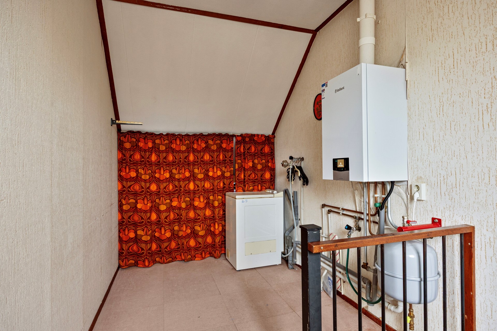 Binnen stap je binnen in een riante hal met garderoberuimte, de meterkast en toegang tot het toilet met fonteintje. Niet hypermodern, maar wel ruim en functioneel. Vanuit de hal is ook de inpandige berging bereikbaar — ideaal voor fietsen, opslag of hobbyspullen.
