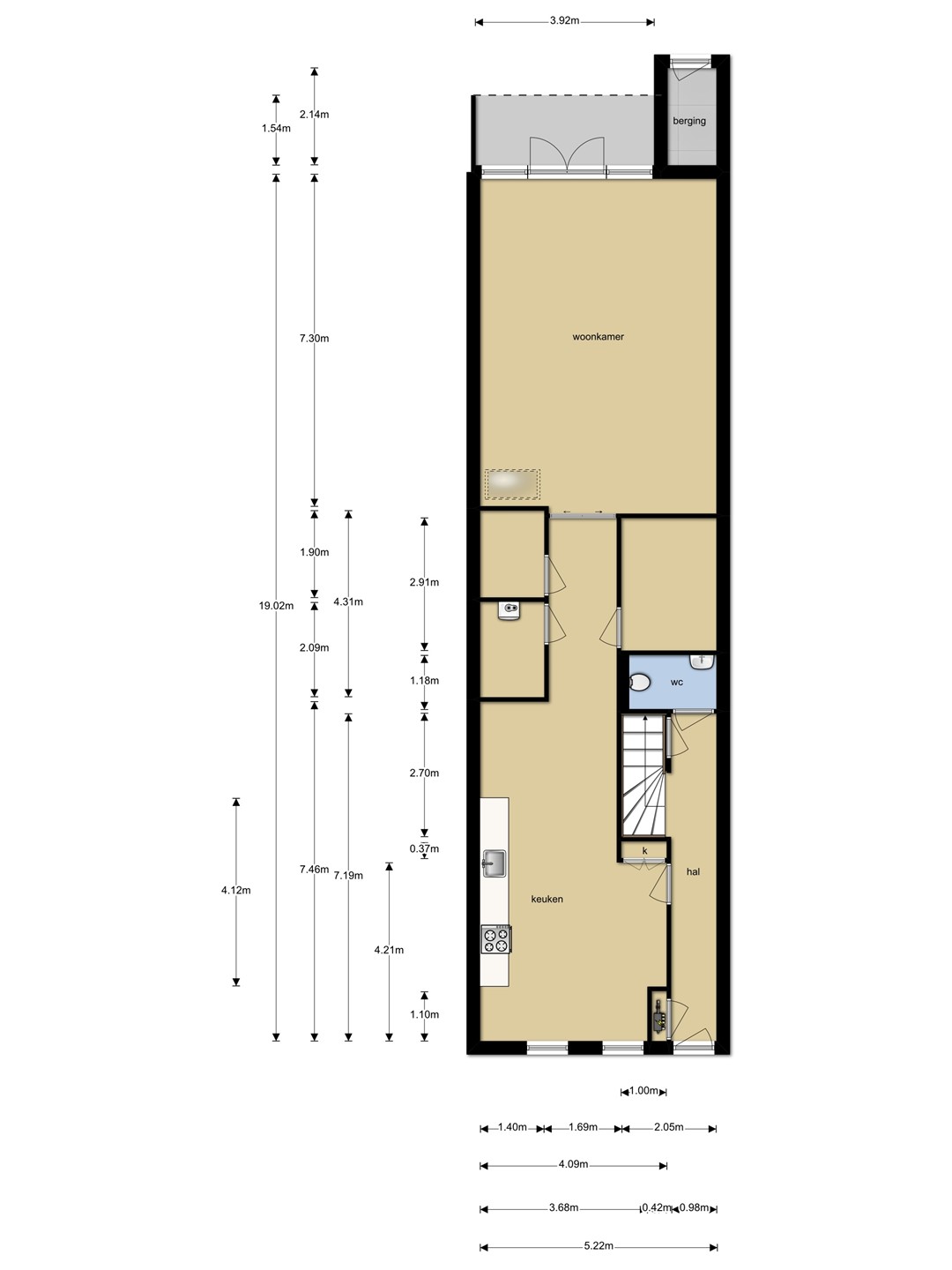 Zodra je de lange hal binnenstapt, voel je de ruimte. Aan het einde een riant toilet met een fontein en onder de mooie authentieke trap ligt een diepe kelder. Door naar de woonkamer. Aan de voorzijde ligt een royale eetkamer met open keuken. Grote schuiframen laten veel licht binnen en geven zicht op het straatleven. De keuken is compleet en afgewerkt met Belgisch hardsteen, een fijne plek voor lange maaltijden of een druk gezinsontbijt. Alle denkbare apparatuur is aanwezig, maar dat zie je vanzelf bij de bezichtiging. Naast de eetkamer is een aparte werkruimte voor rust of juist voor spelende kinderen.