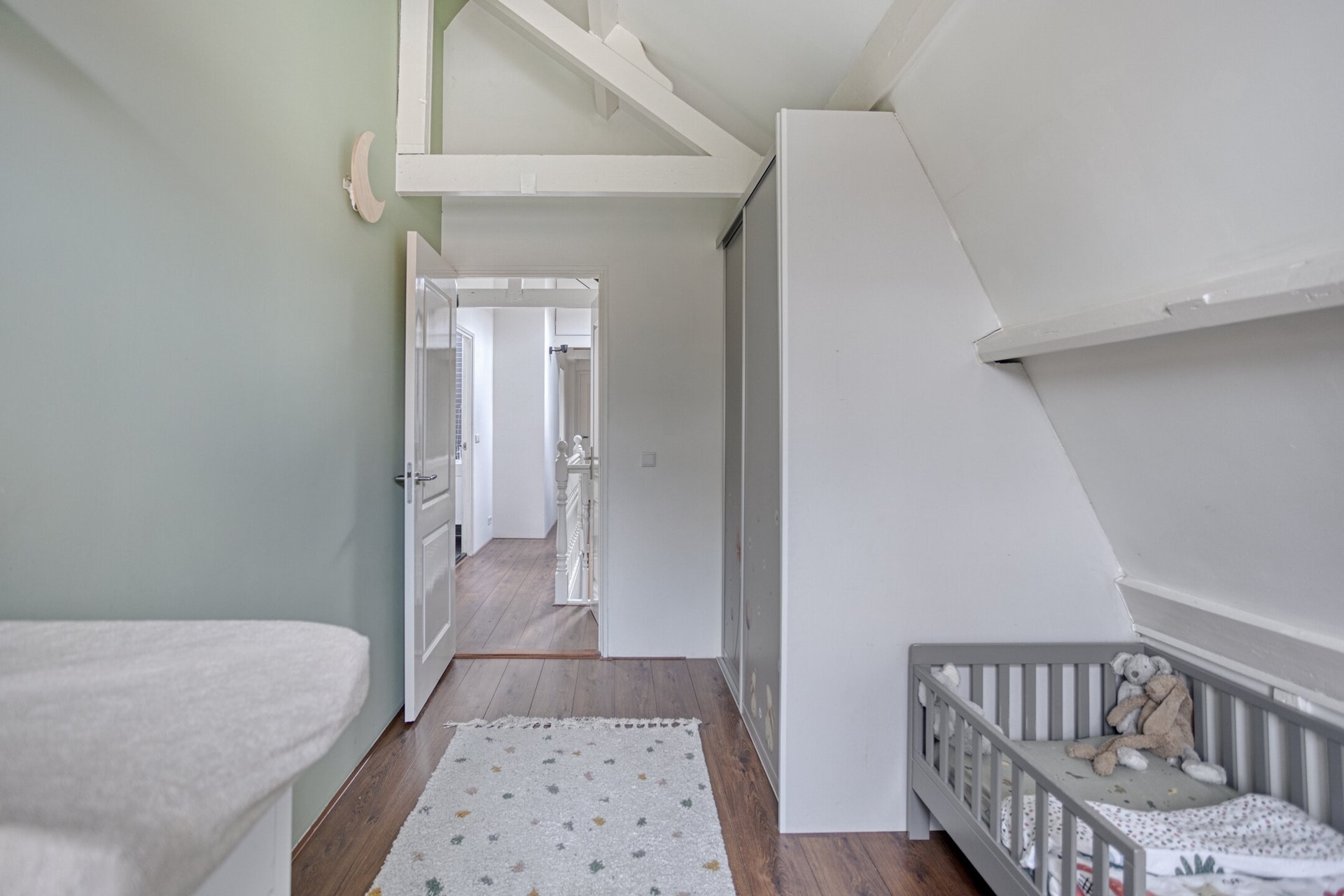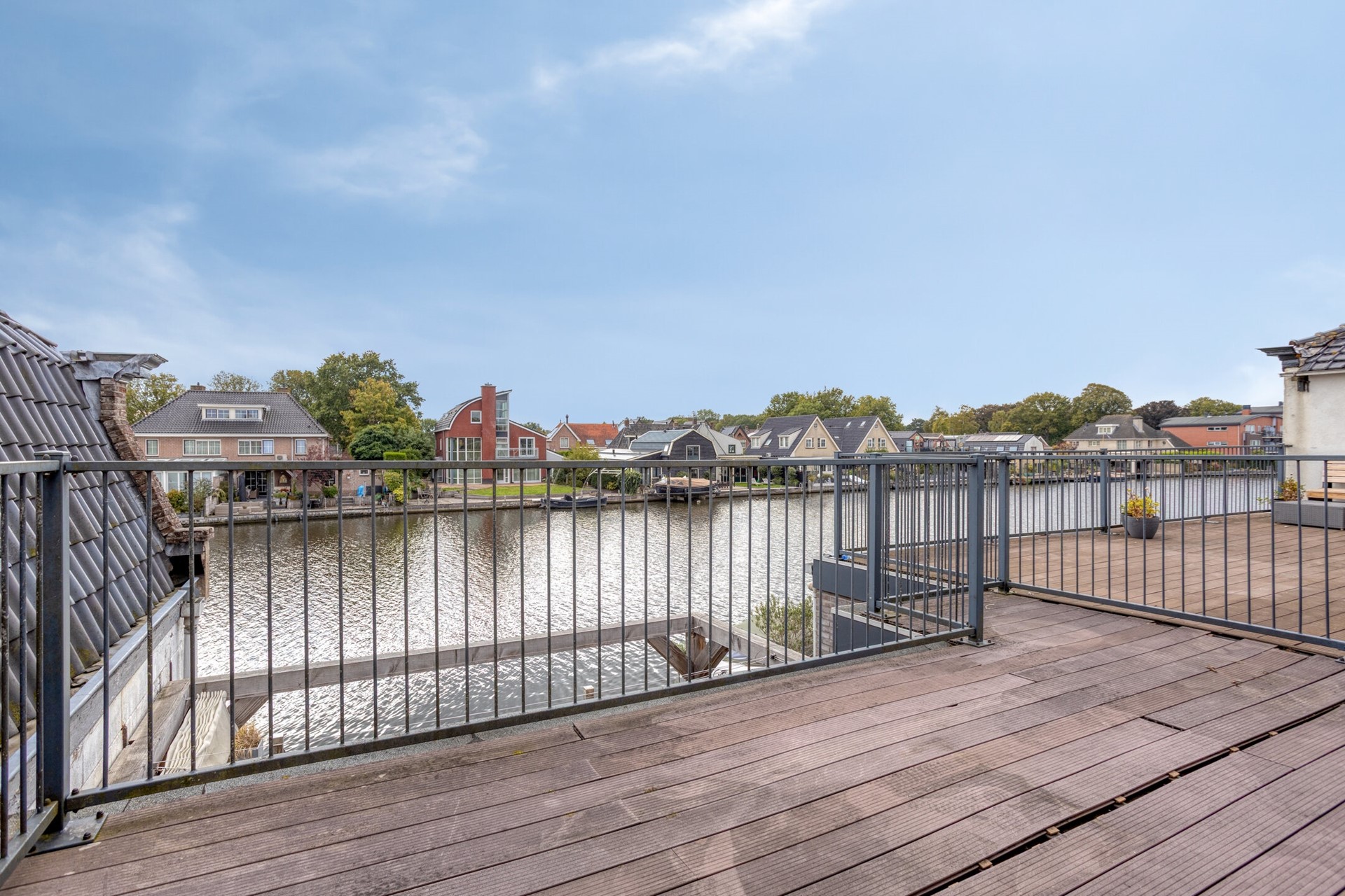 Boven leidt een authentieke trap naar een ruime overloop waar de oude balken zichtbaar zijn gebleven. Dat geeft deze verdieping een warme, eigen sfeer. Er zijn drie royale slaapkamers, een moderne badkamer met bad en douchecabine, een tweede toilet en een praktische walk-in kast/closet. De master bedroom is extra bijzonder: vanuit hier stap je zo het grote dakterras op van circa 21 m². Vanaf dit terras kijk je uit over de Oude Rijn en de daken van de Hoofdstraat – een uitzicht dat elk seizoen meebeweegt.
