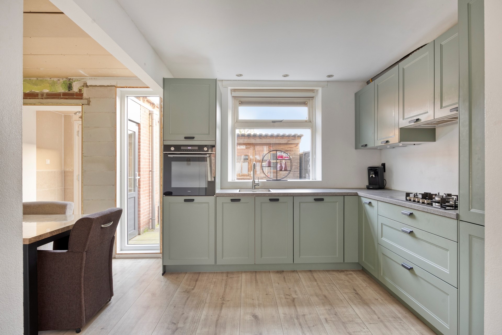 De keuken is juist wél helemaal af (op 1 wand na). Deze is twee jaar geleden vernieuwd en uitgevoerd in een luxe, moderne stijl. Je beschikt over een koelkast, vriezer, 5-pits gaskookplaat, afzuigkap, vaatwasser, oven en vooral veel werk- en bergruimte.