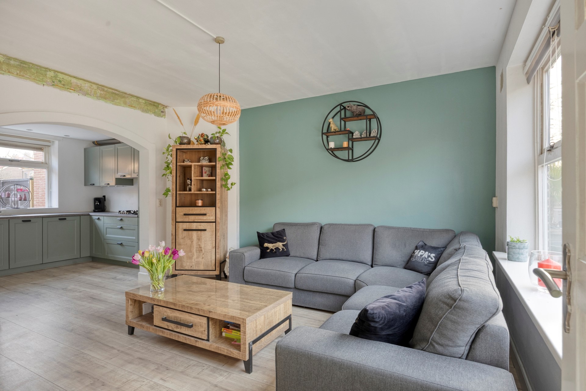 De riante voortuin ligt ideaal op het zonnige zuidwesten en geeft de woning direct een open en prettige uitstraling. Via de entree kom je in de hal met meterkast, trapopgang en toegang tot de woonkamer. We gaan naar die woonkamer toe. Door de duidelijke scheiding met de keuken is dit een fijne, goed in te delen leefruimte van circa 4,5 x 3,90 meter, voorzien van vloerverwarming, bijna afgewerkt en heeft het heel veel daglicht toetreding. Op naar de keuken.