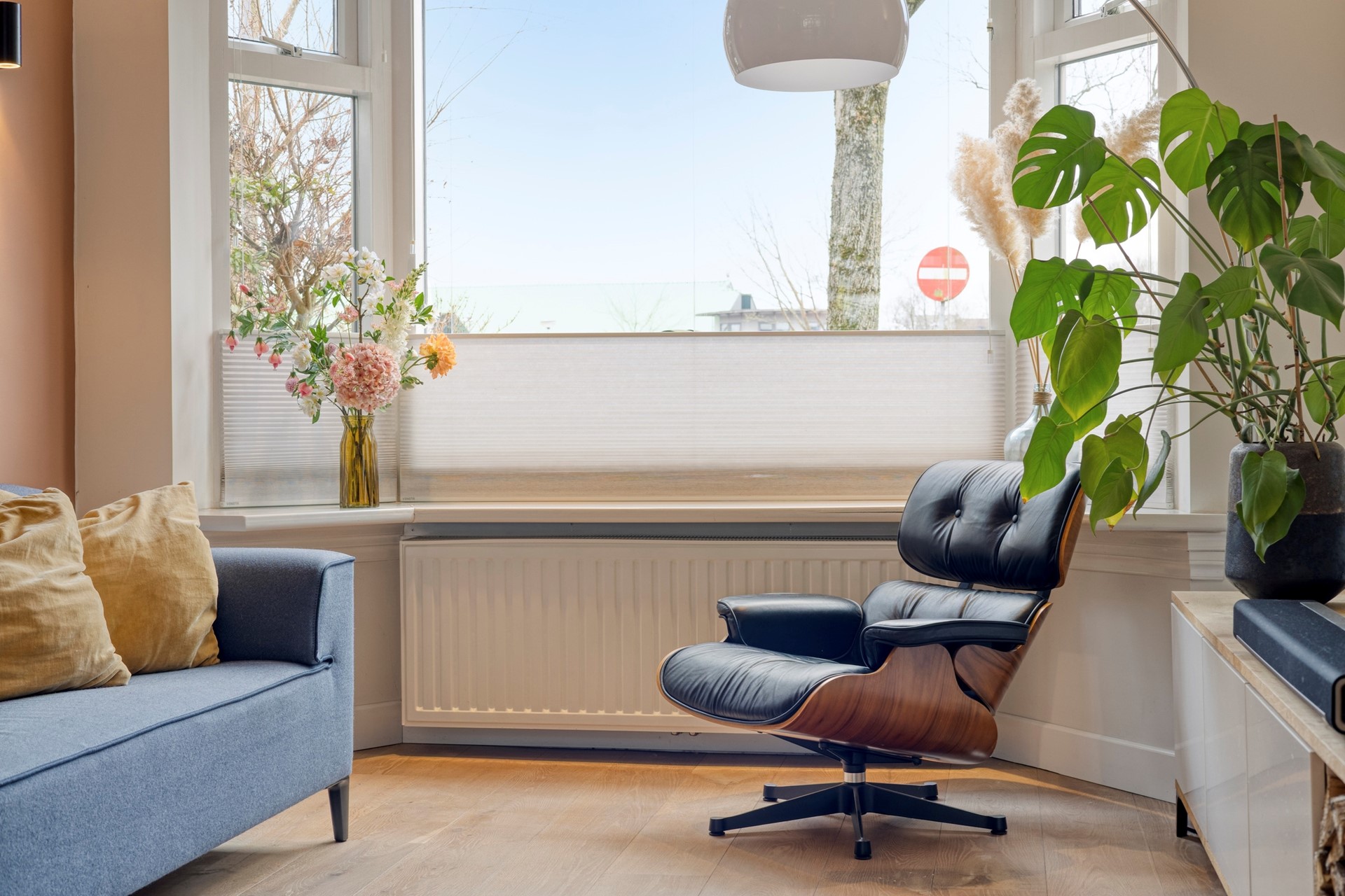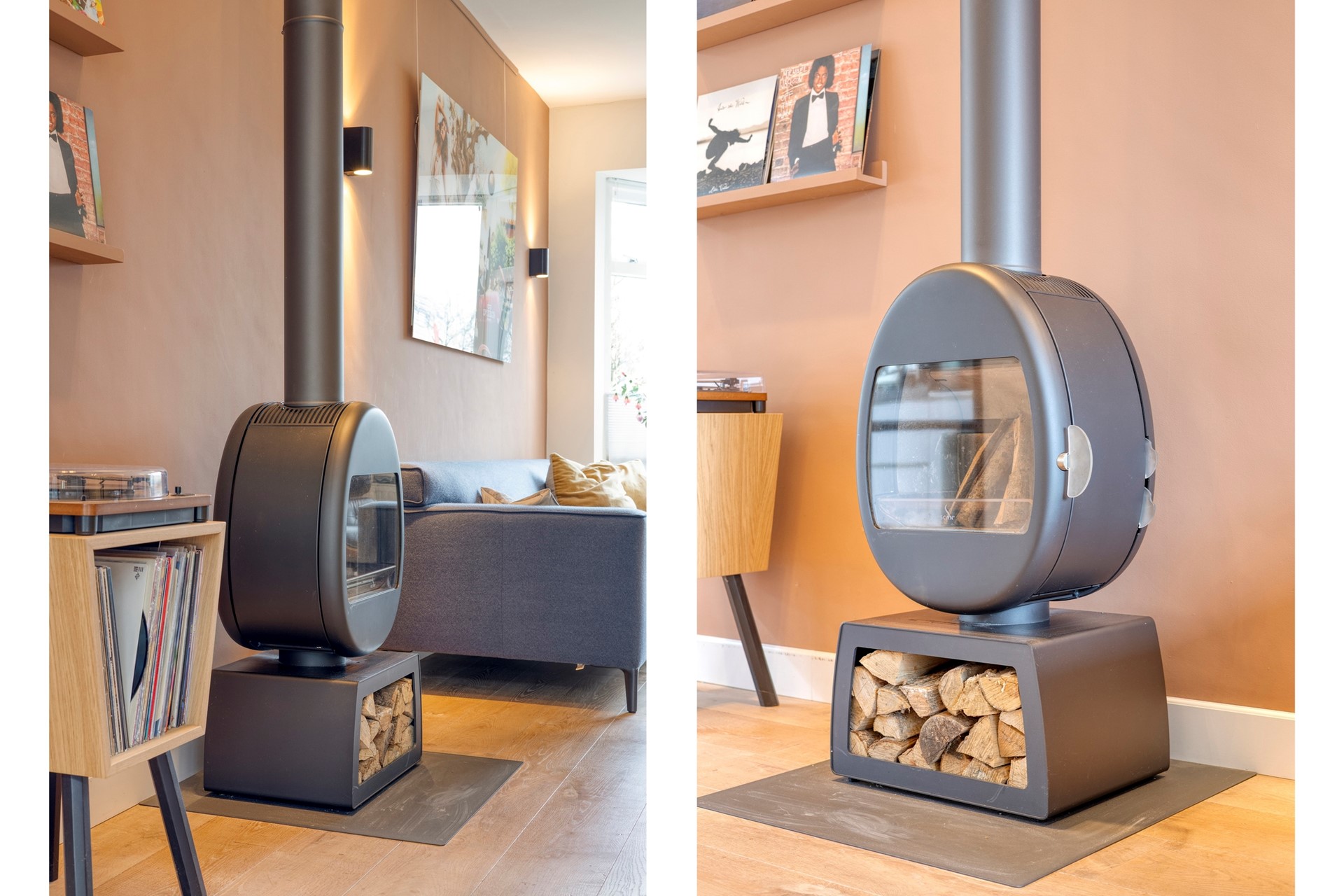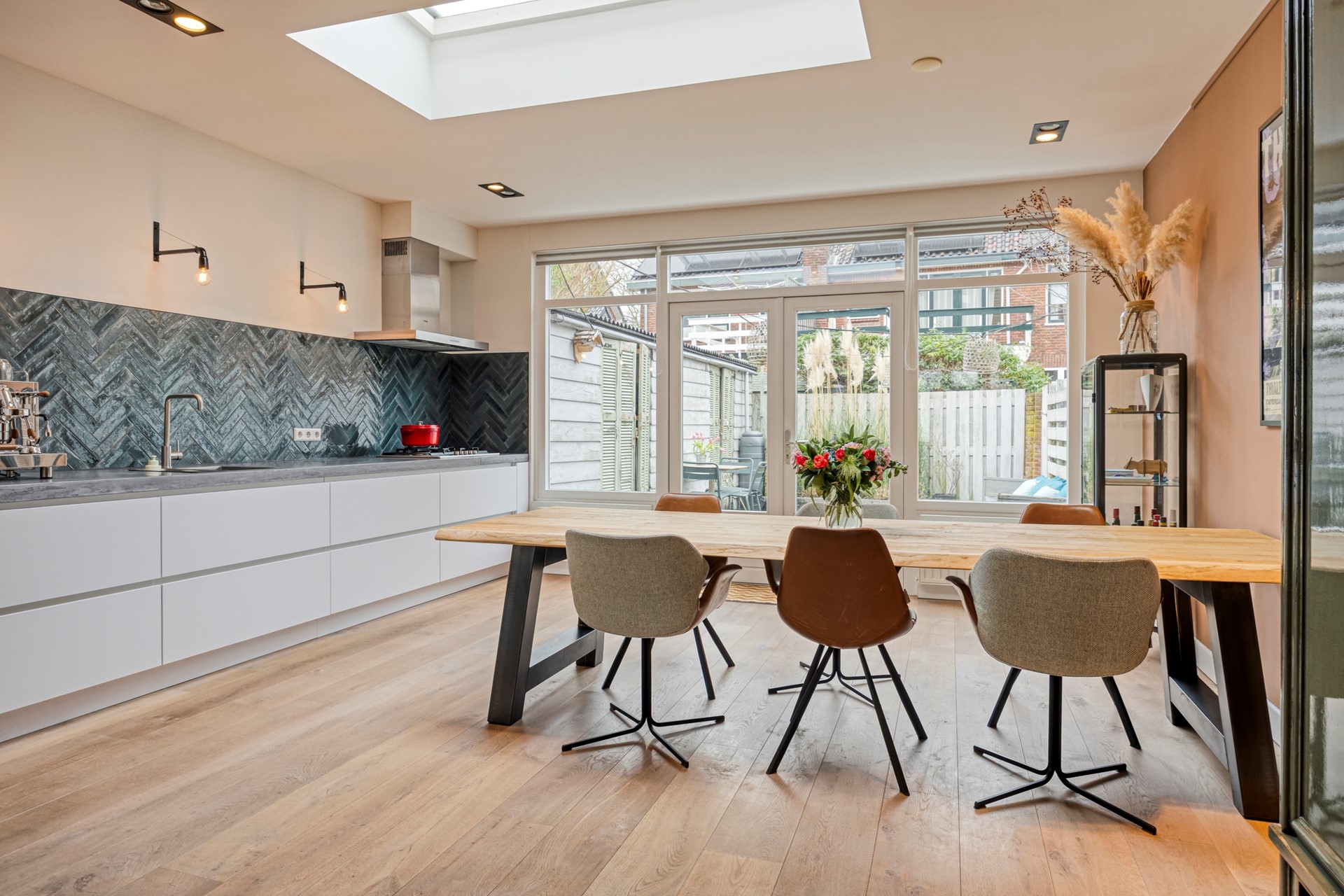 De sfeer is perfect in balans. De houtkachel (ter overname) geeft net dat extra warme accent, al is het (isolatie)comfort in dit huis sowieso al hoog. Via prachtige stalen deuren wordt de ruimte subtiel verdeeld in een voor- en achterkamer, met een mooie houten vloer die alles verbindt.