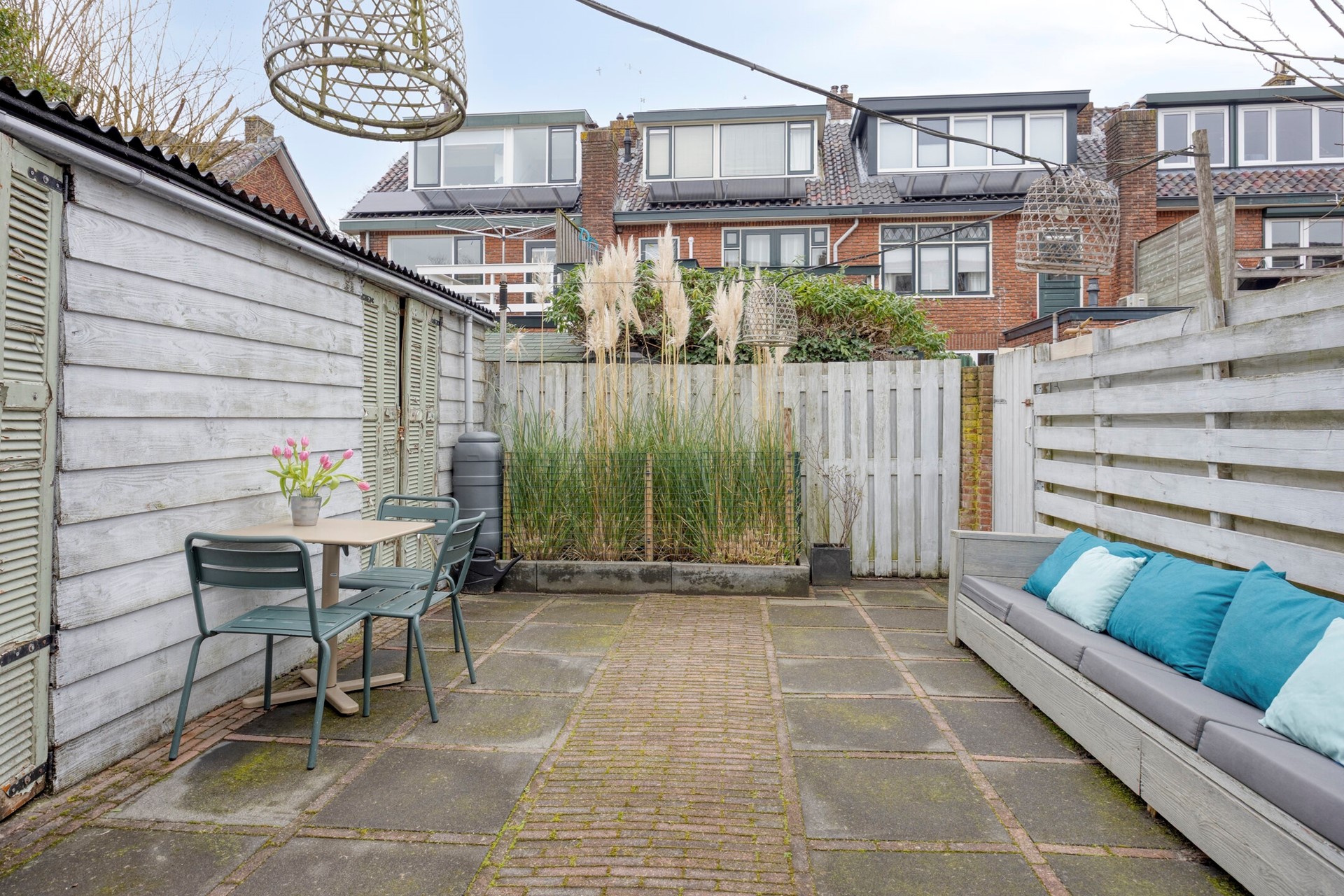 Via de openslaande deuren stap je zo de zonnige achtertuin in, gelegen op het noordwesten. Circa 30 m², met achterom en een schuur voorzien van elektra. Een fijne plek om lang buiten te zitten met zon in de namiddag en de avond. Op naar de eerste etage.