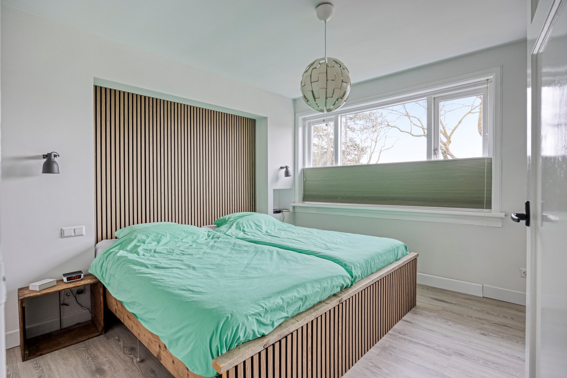 De voorslaapkamer was oorspronkelijk opgesplitst in twee kamers. De huidige bewoners hebben hier een stijlvolle en-suite kledingruimte van gemaakt, echt heel gaaf. Met een eenvoudige wand is hier weer een extra kamer te creëren. De tweede slaapkamer aan de achterzijde is strak afgewerkt, heerlijk licht (groot genoeg voor minimaal een tweepersoonsbed) en biedt toegang tot het platte dak van de uitbouw. Let je ook weer op alle details wat dit huis zo bijzonder maakt?
