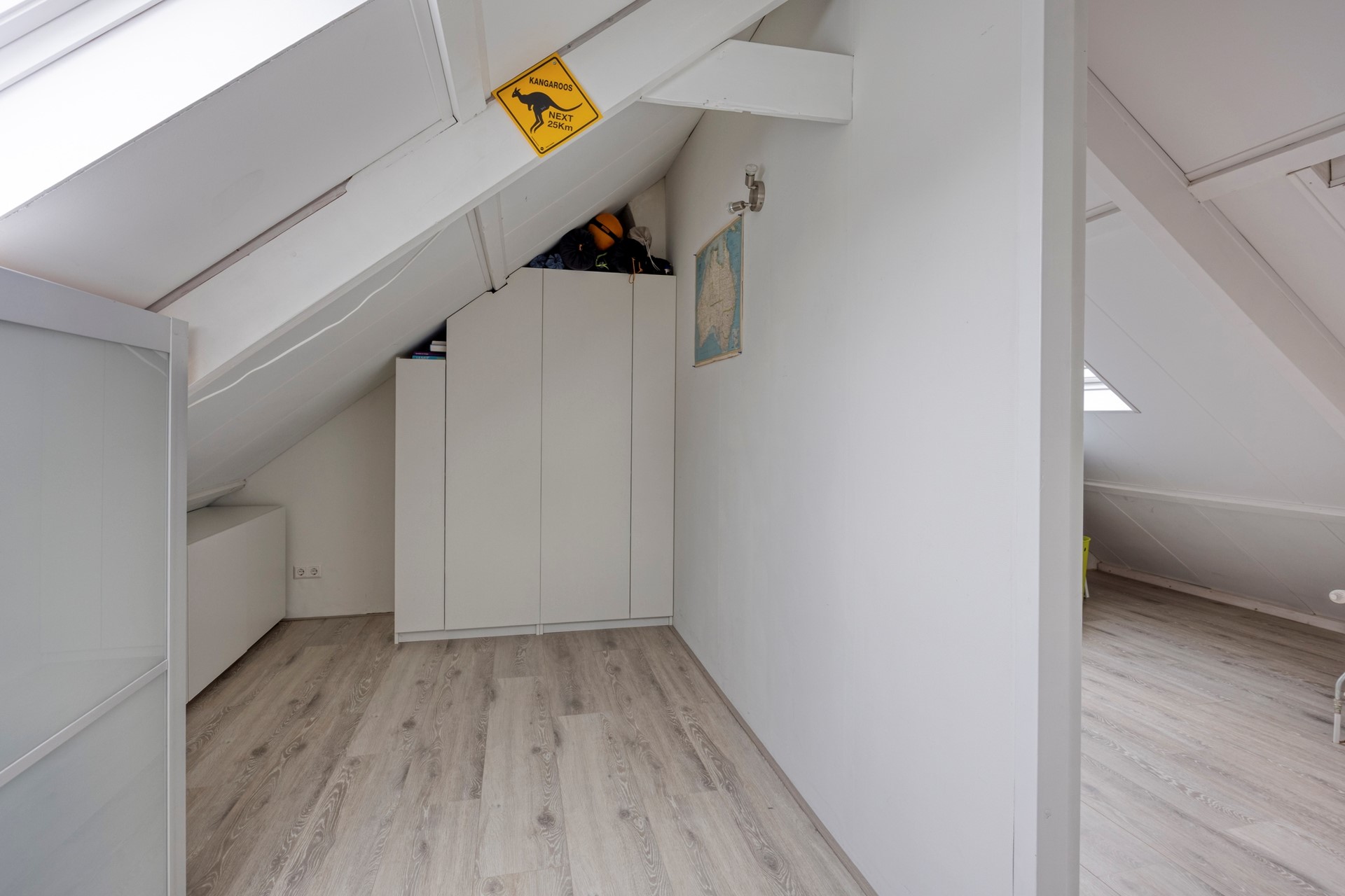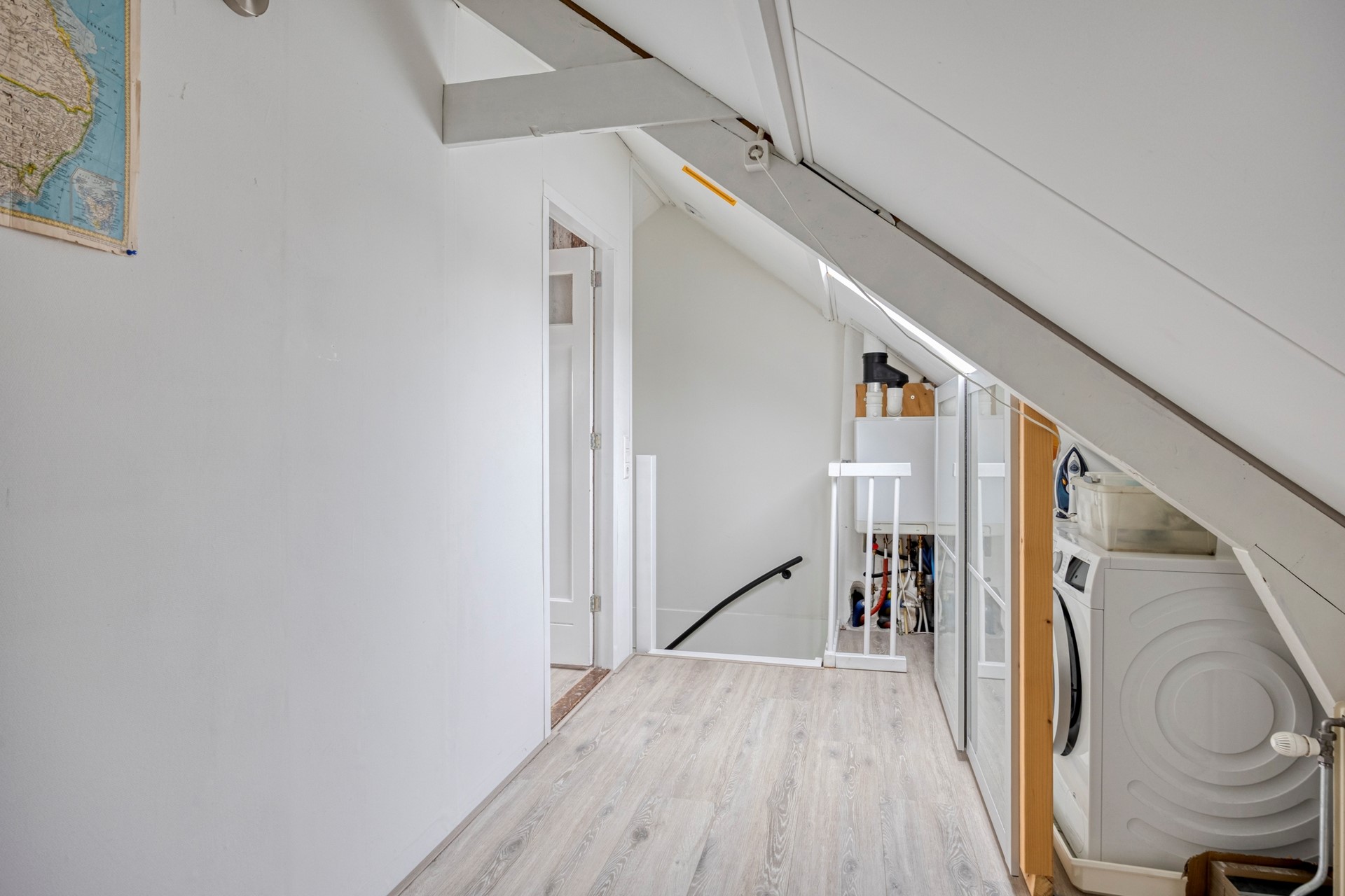 Door naar de zolderverdieping. Deze bestaat nu uit een ruime voorzolder met de cv-opstelling (Intergas HRE, 2016), de wasmachineaansluiting, kastruimte en veel extra bergruimte. Daarnaast is er een grote voorslaapkamer met een dakkapel. Ook hier zie je weer dat alles strak en goed is afgewerkt. Op zolder zijn nog toekomstmogelijkheden: een vierde slaapkamer is eenvoudig te realiseren of de voorslaapkamer te vergroten dmv een grotere dakkapel. Natuurlijk horen daar wel de betreffende vergunningen bij.