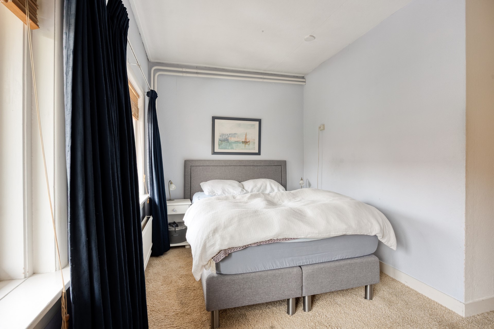 De eerste etage biedt een ruime overloop met de CV-installatie (Vaillant EcoTec Plus, 2023), een eenvoudige maar ruime badkamer met ligbad/douche en wastafel, en twee goed bemeten slaapkamers met vaste kasten (voorheen drie kamers). Via deze etage is ook het dakterras te bereiken (momenteel zonder hek). De master bedroom bestaat dus nu uit de 2 voormalige kamers en is echt serieus groot.